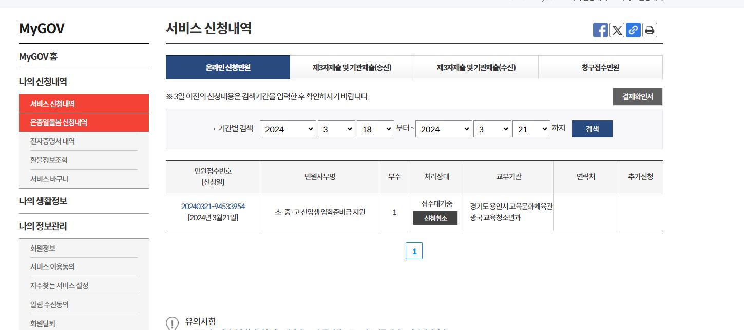 신청이 완료되면 아래와 같이 '접수대기중'이라고 나옵니다.