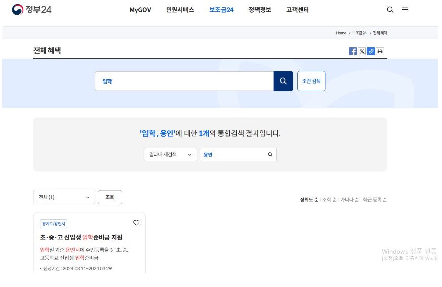 2. '보조금 24'에 들어가서 '용인 입학 준비금' 검색