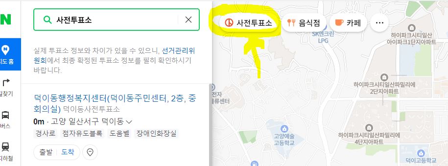 방법2) 네이버지도, T맵, 카카오맵 어플 접속 > 사전투표소 클릭> 사전투표소 위치 확인