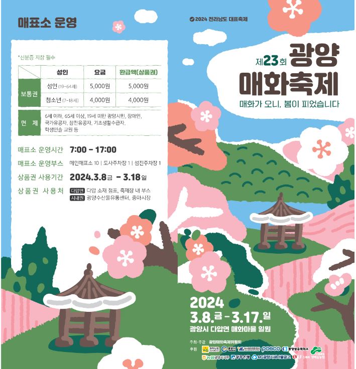 모진 겨울 추위에도 아랑곳 않고 꽃을 피우는 매화의 향기와 풍경을 느낄 수 있는 매화 축제가 전라남도 광양시 다압면 매화마을 일원에서 펼쳐집니다. 올해부터 5천원의 요금이 있지만 지역 상품권으로 환급해주니 광양 시내 또는 축제장에서 사용할 수 있습니다.