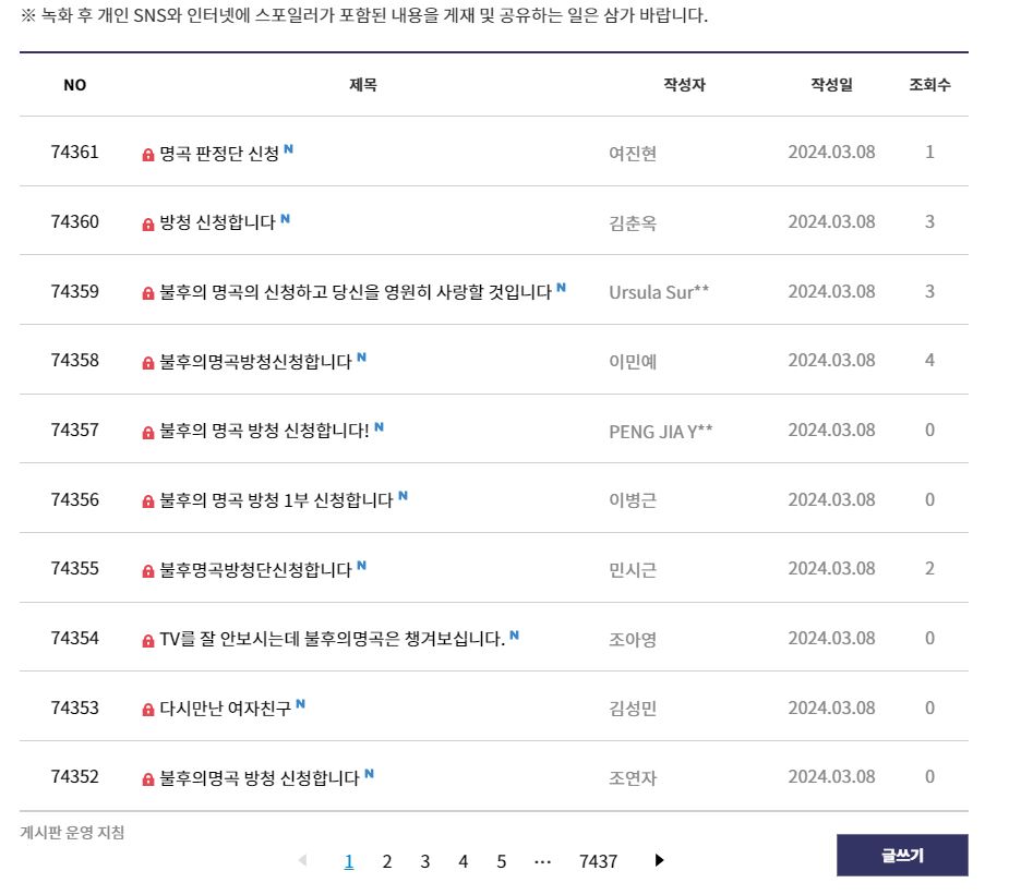 사연신청에 들어가서 아래로 내리면 신청글을 올리는 게시판이 나옵니다.